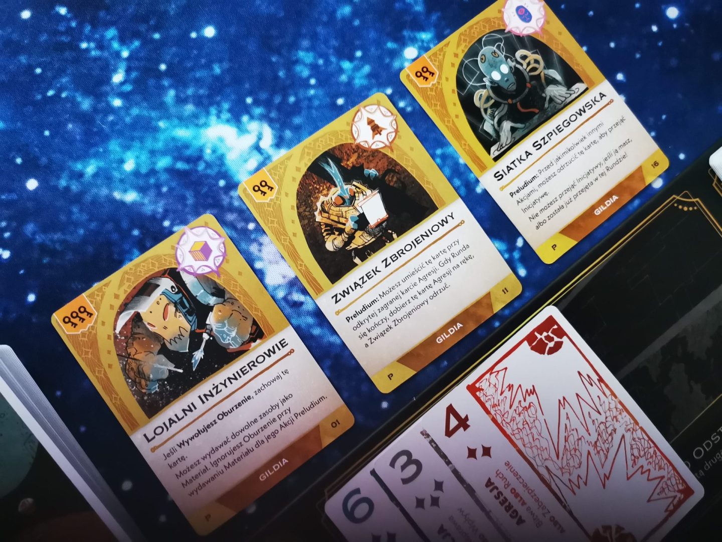 Mechanika jest prosta do nauczenia, ale w praktyce ma naprawdę sporo głębi i miejsca na optymalizację. Nie budujemy tu silniczków, nie warto kitrać kart na później, bo Arcs to gra wykorzystywania okazji, blefowania i dobrego timingu. Warto jeszcze dodać, że przebijanie i zbieranie lew daje nam inicjatywę, czyli bycie pierwszym graczem, co jest naprawdę ważne. Podobało mi się, że gra nie zostawia miejsca na nudę nawet w tak zmuszającym do myślenia momencie – każda karta to wybór, każda akcja zmienia sytuację na planszy. Trick-taking nie jest tu dodatkiem – to serce gry, który napędza wszystkie konflikty.