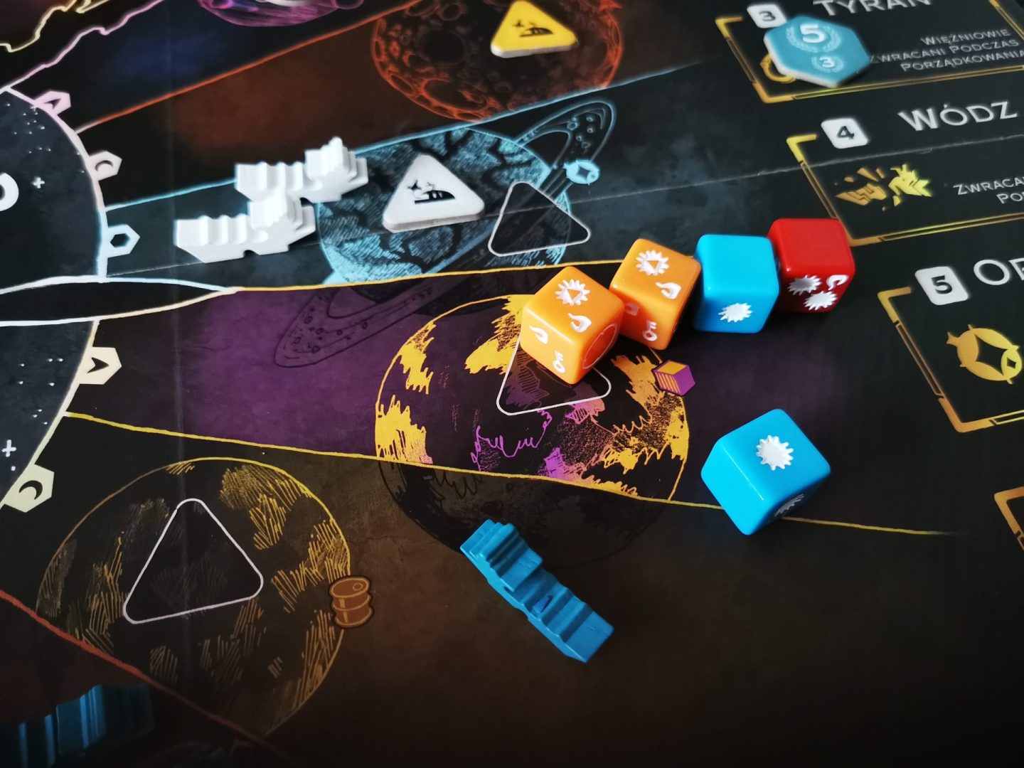 Arcs to gra z bardzo wysokim poziomem interakcji. Nie tylko non stop walczysz – kontrolujesz obszary, zawiązujesz tymczasowe sojusze, patrzysz, komu bardziej opłaca się pomóc. Nawet najmniejsze posunięcia zmieniają układ sił. Zwłaszcza przy czterech graczach robi się na planszy ciasno i… bardzo emocjonująco. Bitwy są szybkie i brutalne. Rzucasz zestawem trzech typów kości, a wyniki widać natychmiast bez zbędnego sprawdzania masy wyjątków. Nie ma tu wielkich kalkulacji, żmudnych przeliczeń, jak w Twilight Imperium czy innym kosmicznym molochu. Chcesz zaatakować? Wybierasz przeciwnika, rzucasz i patrzysz co wyszło. Brawura czasami kończy się spektakularnym pechem, czasami wygraną na jednej kostce.