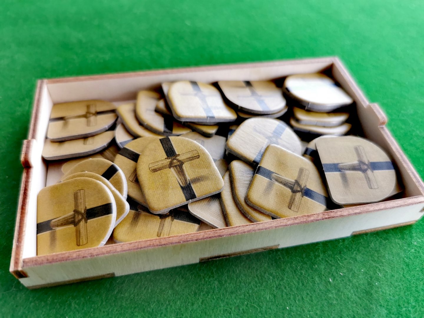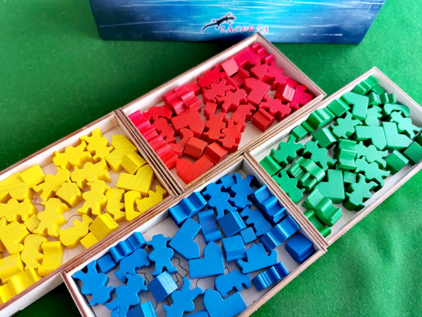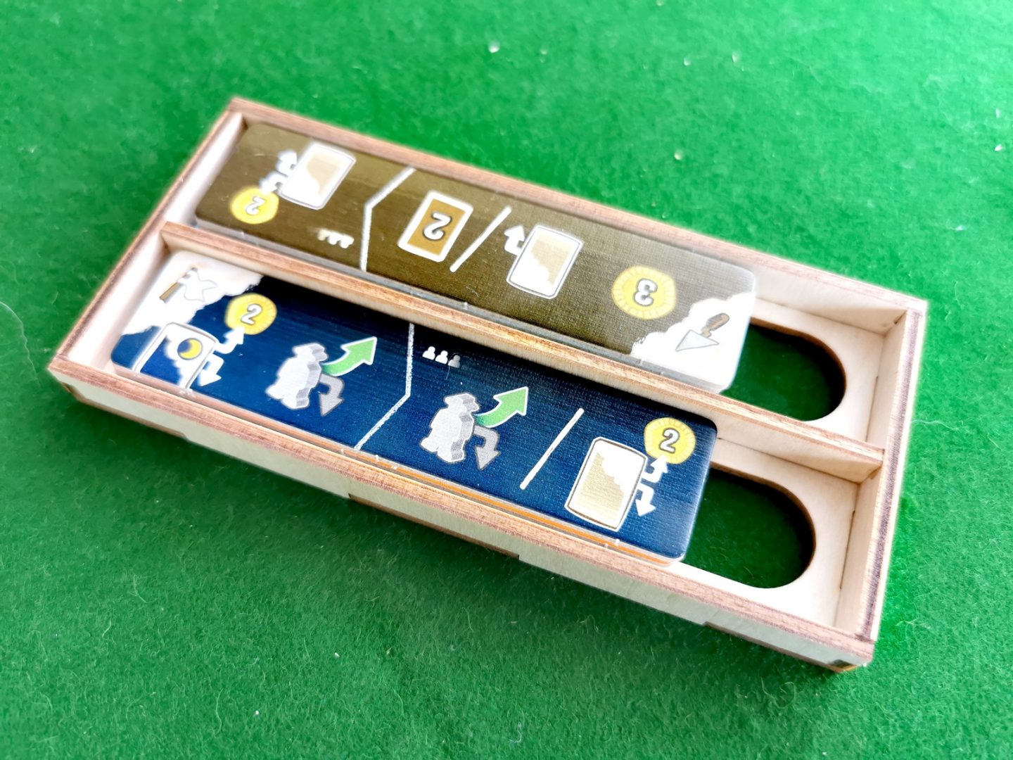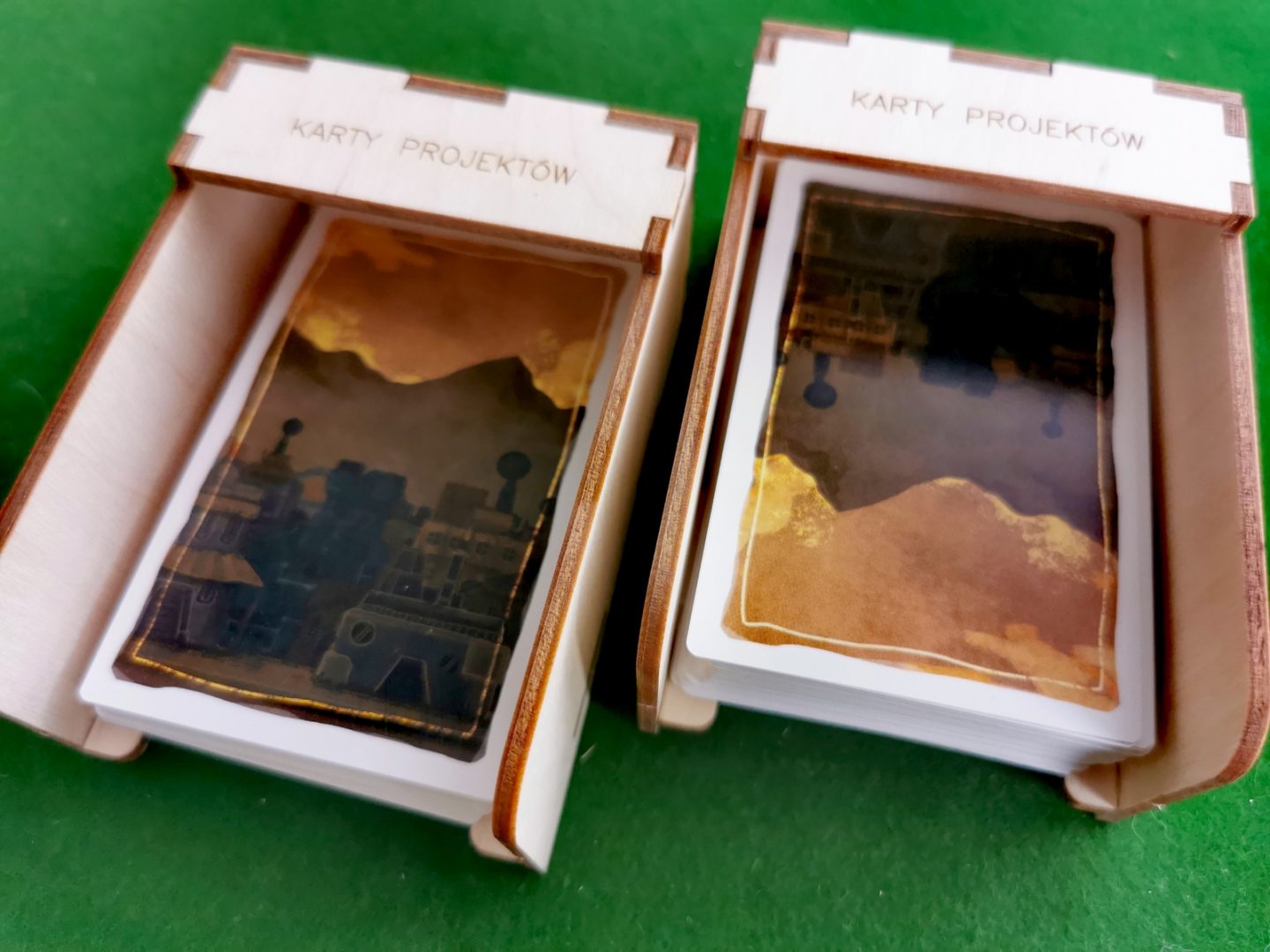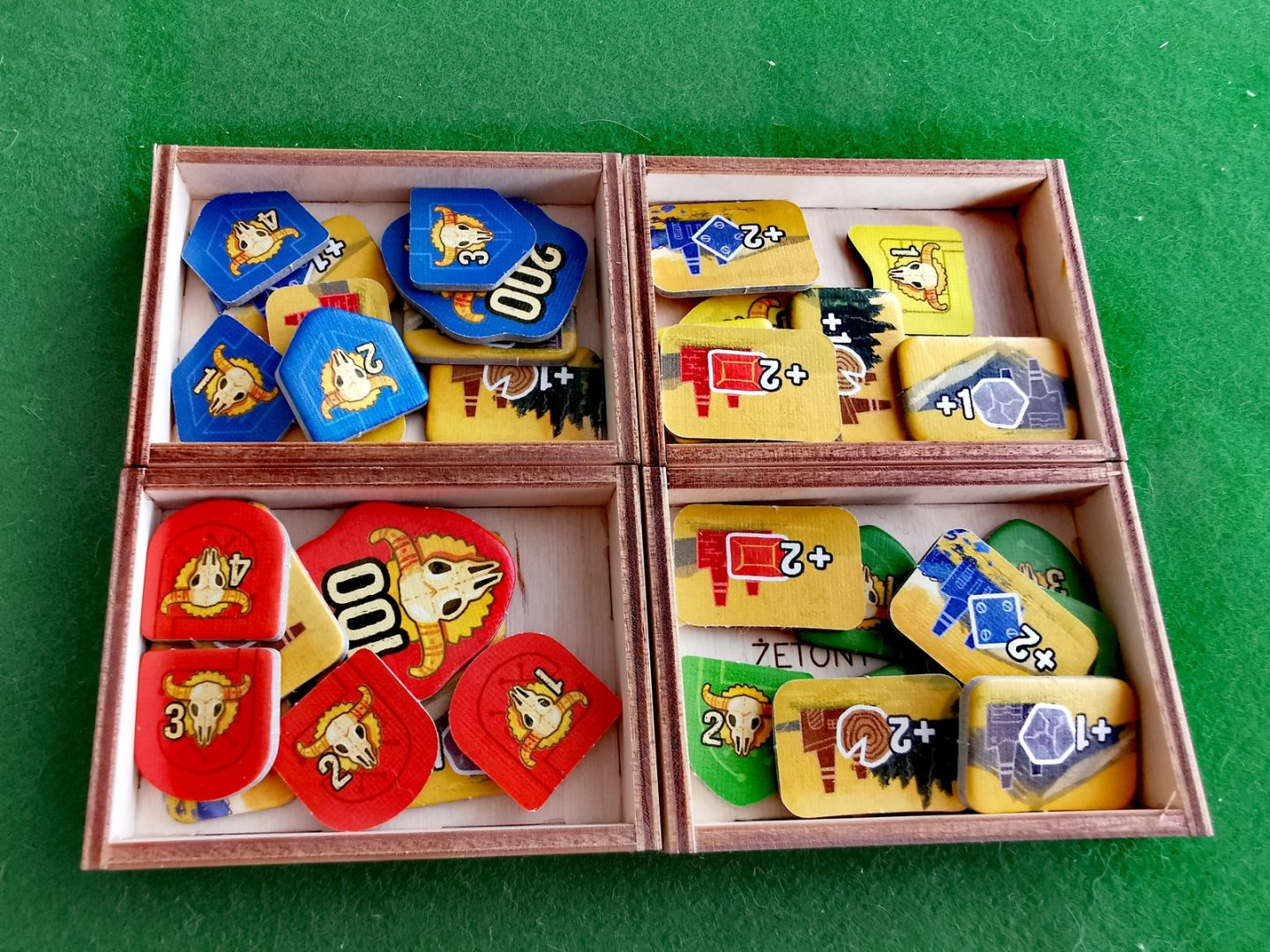 Pudełka na kartonowe elementy graczy idealnie mieszczą wszystkie tekturowe żetony potrzebne każdemu z graczy. Na początku zastanawiałem się, po co elementy kartonowe zostały oddzielone od drewnianych, ale jak wyobraziłem sobie ocieranie się drewna o karton i przyspieszone niszczenie elementów doceniłem pomysł. Podczas rozgrywki trochę niezgodnie z ich przeznaczeniem trzymałem tam niedostępnych jeszcze ludzi – miałem pionki pod ręką i nie walały się po całym stole.