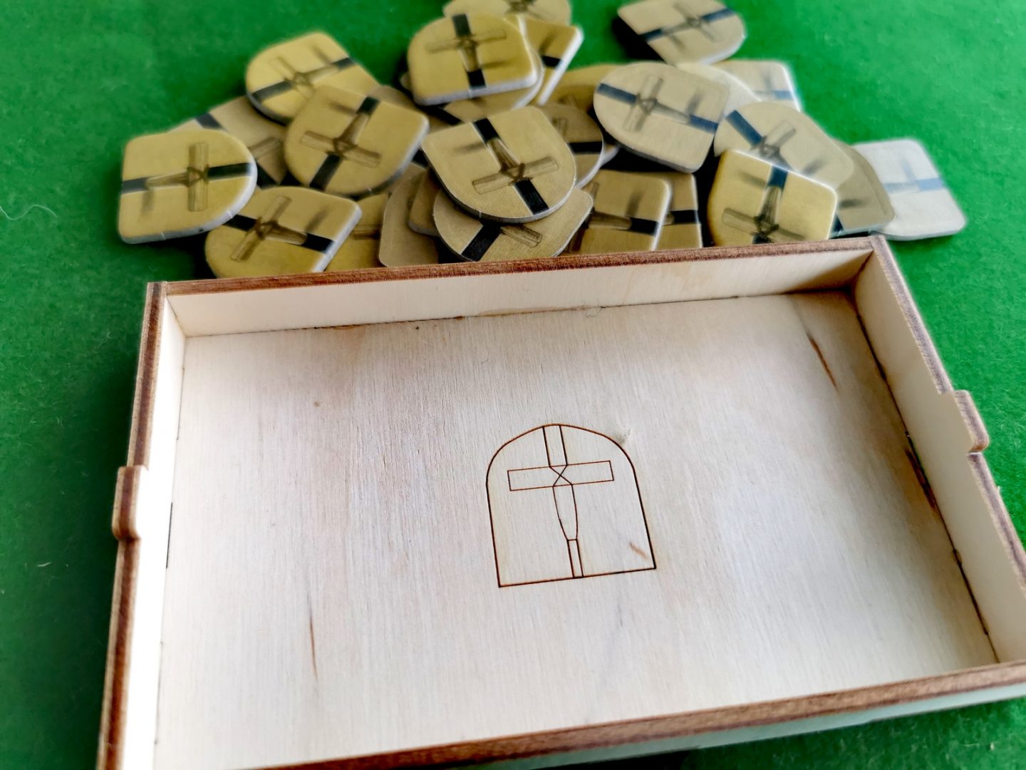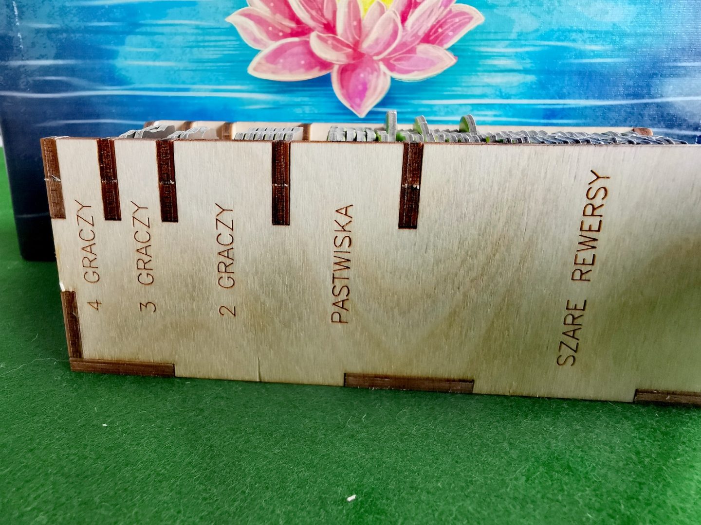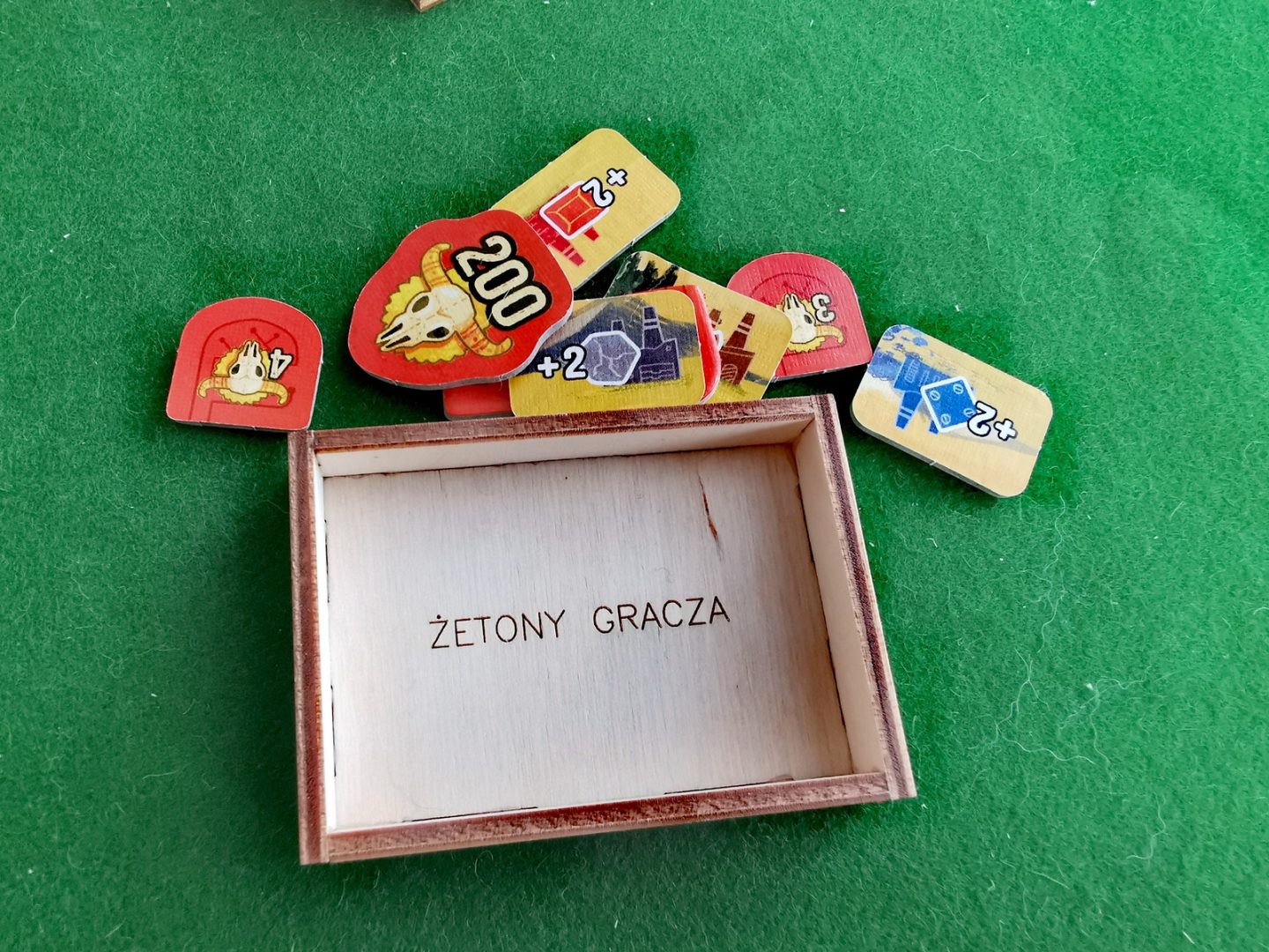 Pudełka na drewniane elementy graczy są dość wygodne i pojemne, chociaż zdarza się potrzeba wyrównania ludzików. Jeżeli tego nie zrobimy nie położymy na nie kolejnego pudełka i wieczko się nie domknie. Od razu też wiemy, co powinno się w nim znaleźć dzięki grawerom na dnie. Podczas rozgrywki raczej się nie przydaje i czeka grzecznie w dużym pudle.