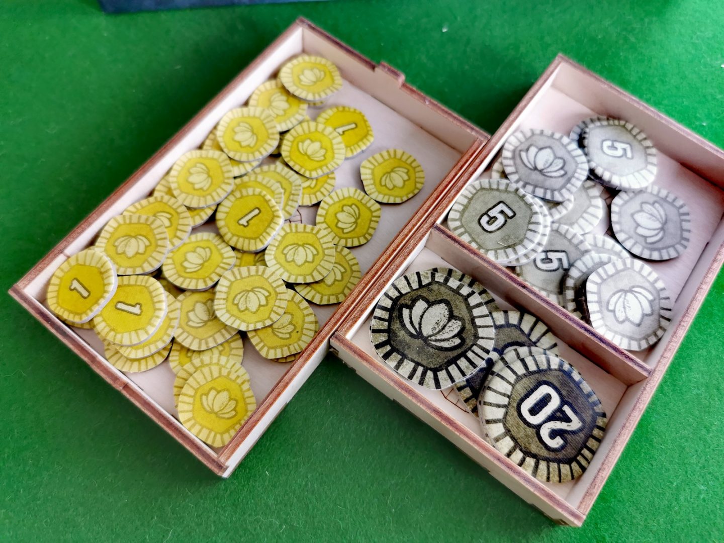 Pudełka na monety mają na dnie odpowiedni grawer z wartością. Dobrze spełniają swoją rolę i są wykorzystywane podczas rozgrywki. Każdy nominał ma swoją przegródkę, więc nie tracimy czasu na szukanie odpowiedniego pieniążka.