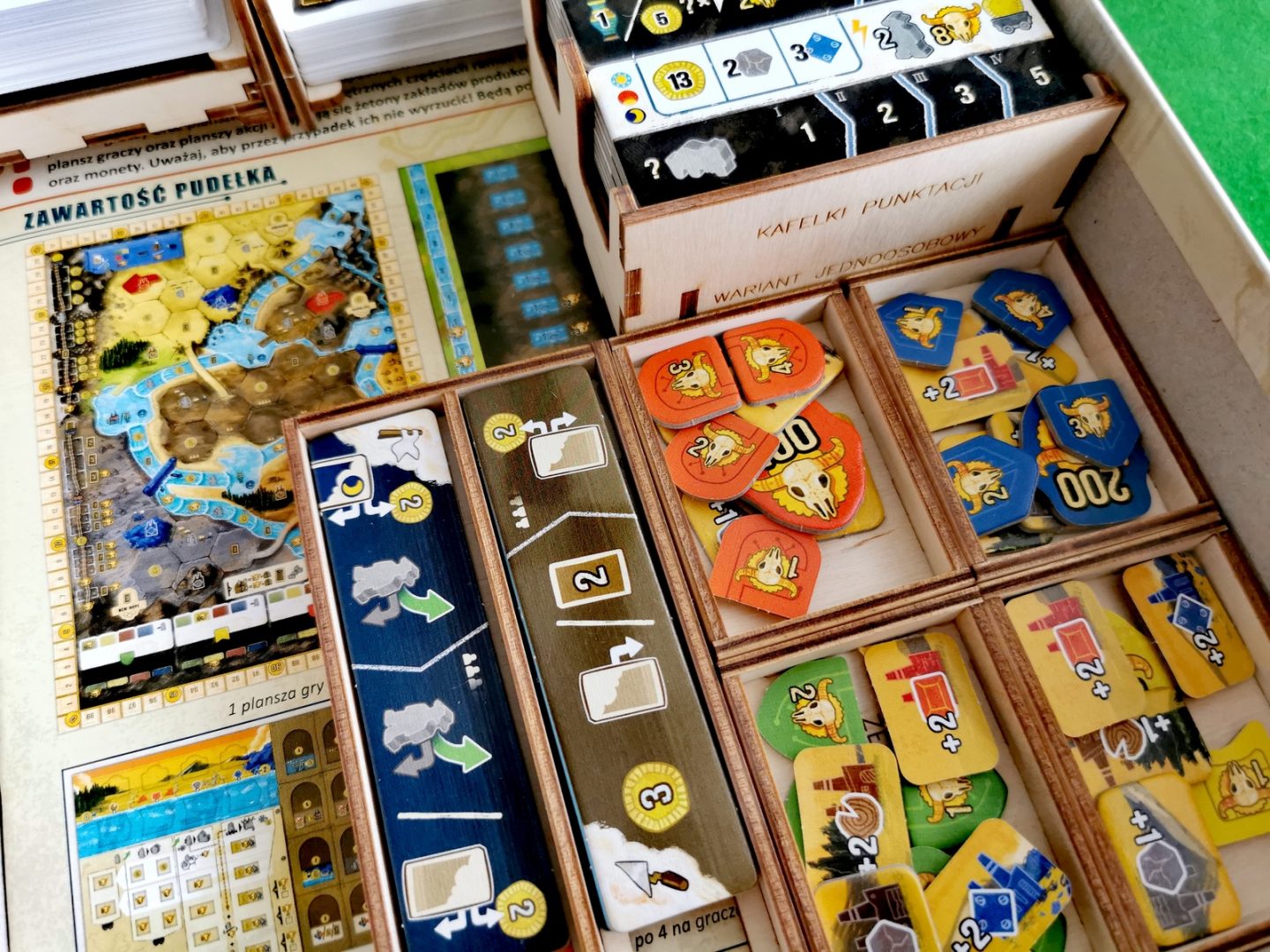 Stojaki na karty spokojnie zmieszczą wszystkie nawet w grubych koszulkach. Fajnie, że są trzy, więc można je wygodnie porozstawiać po całym stole i dać wygodny dostęp dla wszystkich graczy. Jeden z stojaków ma szufladkę z miejscem na pudełeczko w których przechowujemy żetony waz oraz znaczniki potrzebne do punktowania regionów.