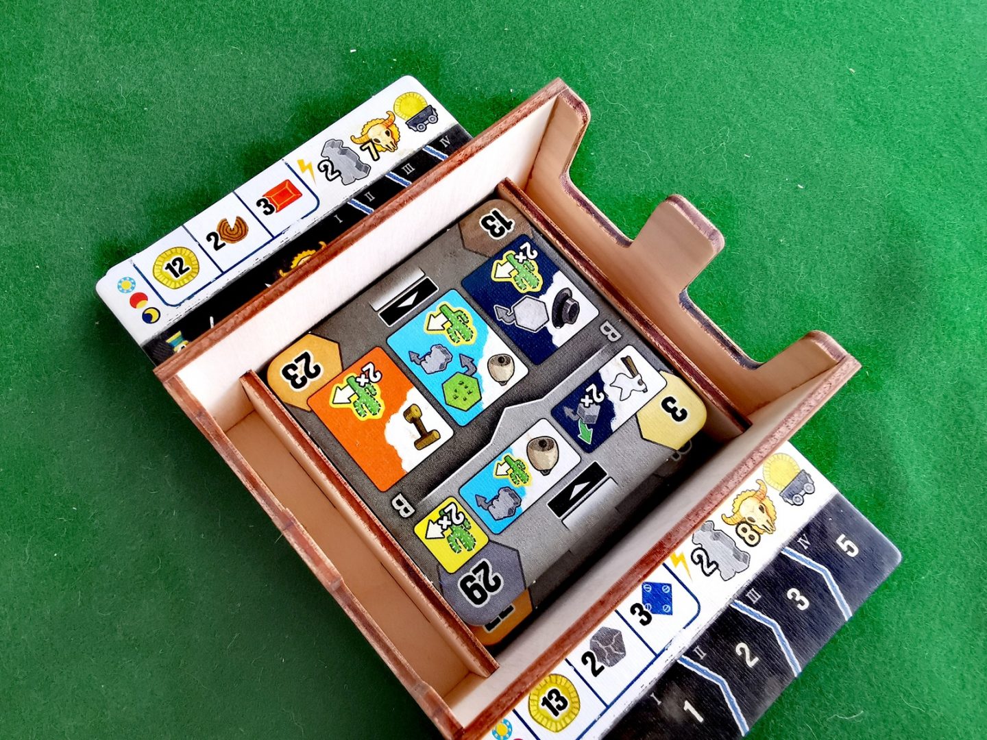 Pudełko na kafle punktacji oraz kafle trybu solo. W podstawie mamy idealnie skrojone miejsce na kafelki z trybu solo. Na wierzchu trzymamy kafle punktacji, które musimy podzielić na dwa stosy. Nie do końca byłem zadowolony z tego rozwiązania, ale nie przeszkadzało mi w układaniu gry, a po zebraniu potrzebnych kafli i tak trafia do głównego pudła.