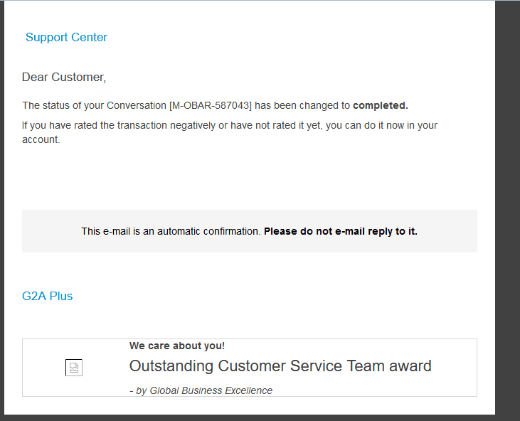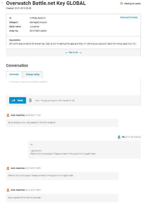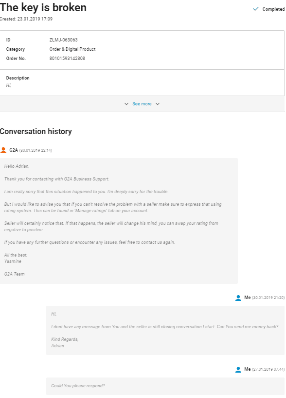 Hehe, śmieszki prawda? Mam się skontaktować ze sprzedawcą. Bystra Pani Yasmine zamknęła także ten case. Więc zostałem z niczym – zarówno sprzedający zamyka konwersacje, jak i samo G2A nam nie pomoże. Bo niby dlaczego prawda? Mają z tego solidny procent pieniędzy z prowizji. Oczywiście otworzyłem drugi case, już nie taki miły, ale nie ma co tutaj pokazywać bo nikt tam nie odpisał, a że minęło już 72 godziny, to komunikat zmienił się na waiting for response.