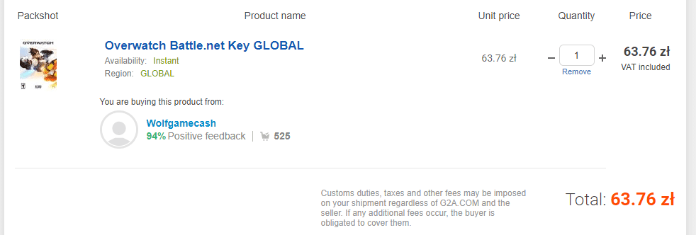 Poniżej przypadki koszyków z różnymi produktami oraz różnymi cenami. Najpierw mój nieszczęsny Overwatch. Pierwsza cena jaka widzimy w koszyku: