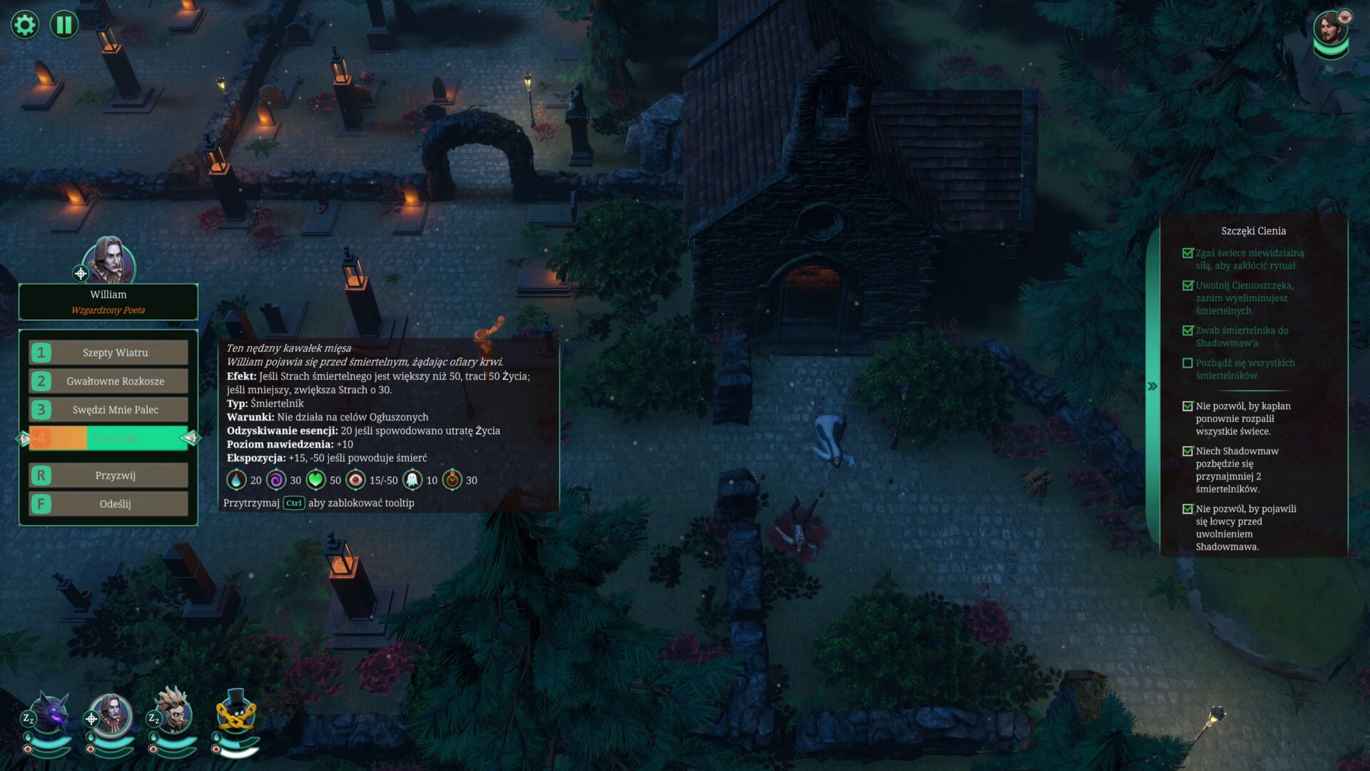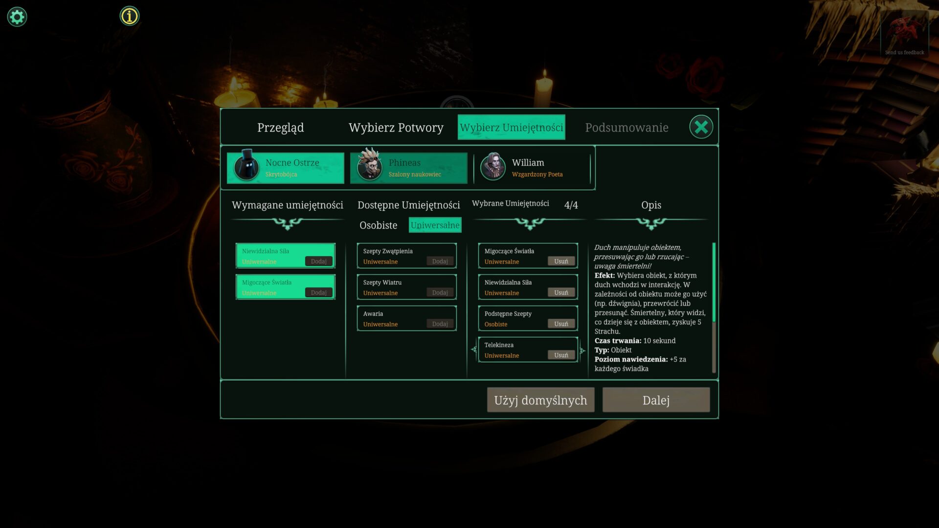 Z drugiej strony trzeba uczciwie przyznać, że jak na wczesny dostęp Ghost Keeper jest zaskakująco stabilny. Bugi istnieją – migające obiekty, zawieszające się AI, powtarzające się kwestie dialogowe – ale nie są to błędy, które całkowicie psują zabawę. Widać, że twórcy mają solidne podstawy i wiedzą, w jakim kierunku iść. Dużym plusem jest też przystępność. Ghost Master potrafił być bezlitosny. Tu poziom wejścia jest znacznie łagodniejszy, a tutorial – mimo że momentami zbyt ogólny – daje wystarczająco informacji, żeby zrozumieć podstawy. Przydałyby się jednak lepsze opisy umiejętności z przykładami zastosowania. Czasem czytasz nazwę zdolności i zastanawiasz się, w jakiej dokładnie sytuacji przyniesie największy efekt.