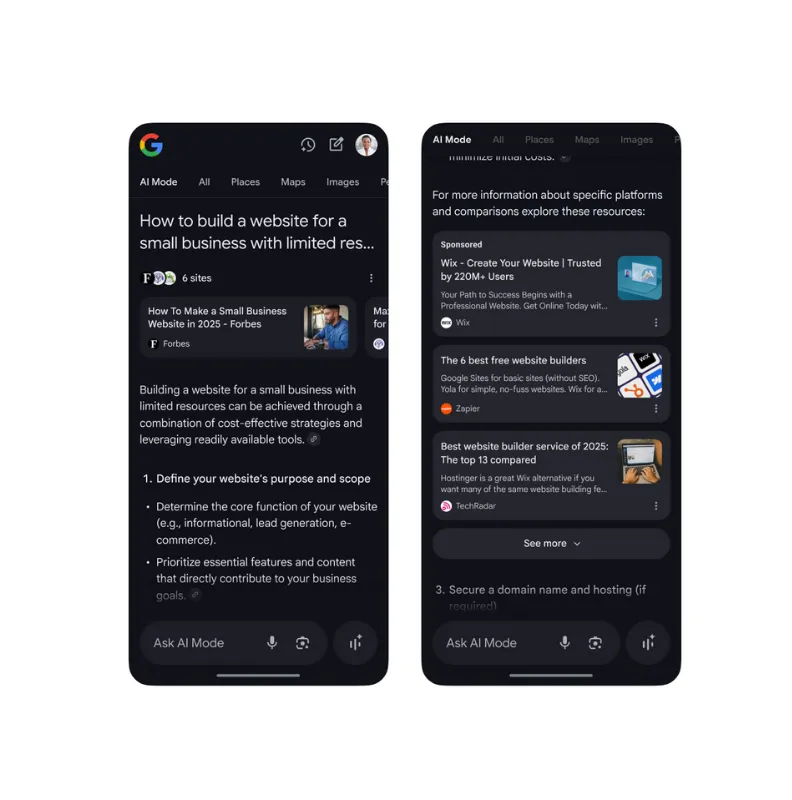To właśnie w AI Mode Google widzi przyszłość reklamy. Według Robby’ego Steina z Google, tradycyjne reklamy nie znikną, ale ulegną głębokiej transformacji. Zamiast klasycznych linków sponsorowanych, użytkownicy mogą wkrótce zobaczyć reklamy dopasowane do kontekstu rozmowy z AI. Na przykład, jeśli ktoś zrobi zdjęcie swoich butów i zapyta o podobne modele, Google AI nie tylko znajdzie rekomendacje, ale może też wyświetlić produkty sponsorowane od marek oferujących podobne obuwie. Podobnie, jeśli użytkownik zapyta o restaurację spełniającą określone wymagania – np. wegańskie menu, dostęp dla dużych grup czy klimatyzowaną salę – AI Mode może przedstawić wyniki wraz z ofertami partnerów reklamowych, którzy pasują do kryteriów. W ten sposób reklamy staną się częścią spersonalizowanego doświadczenia, a nie oddzielnym, nachalnym elementem. Google określa to jako „bardziej pomocny” sposób prezentacji treści reklamowych.