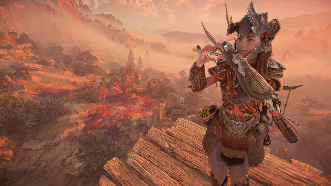 Horizon Forbidden West wygląda oczywiście przepięknie i posiada cudowną ścieżkę dźwiękową dostępną na spotify. Gra posiada niesamowity, tak bardzo specyficzny dla siebie klimat przepięknego świata po strasznej katastrofie, który powoli przywraca się do życia. Przechodzące tu i tam potężne maszyny przypominające zwierzęta, zarośnięte ruiny, majestatyczne góry czy też olbrzymie jeziora skrywające dawno zapomniane artefakty. Niestety jeziora także będziemy mogli zwiedzać dopiero po odblokowaniu maski tlenowej. Warto pochwalić także mimikę twarzy oraz same dialogi, które wywarły na mnie olbrzymie wrażenie. Postacie nie stoją w miejscu podczas rozmów, a gestykulują, a ich twarze nie raz reagują na bieżące rozmowy. Rozmowa Aloy z królem na początku gry wywarła na mnie olbrzymie wrażenie, a potem ten efekt nie znika. Do tego warto wspomnieć o zróżnicowanych strojach różnych kultur, które spotyka główna bohaterka na swojej drodze. Niesamowite zróżnicowanie i oryginalne połączenie części nowoczesnych maszyn oraz ludowych strojów buduje niesamowity klimat.