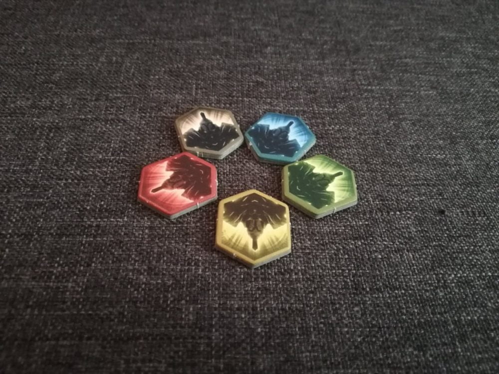 Mimo to, zawartości jest bardzo dużo – pudełko po otwarciu już się nie zamyka. W pudełku jest wypraska, ale wydaje się ona za wysoka, przez co tekturą wypycha denko. Na szczególną uwagę zasługują monumenty bogów zbudowane z segmentów – każda kolejna budowa monumentu, to kolejny segment na planszy. Fajnie to wygląda w grze.