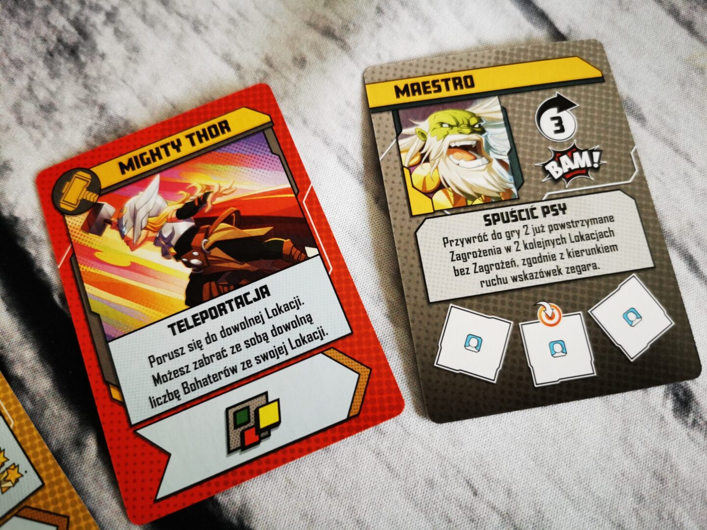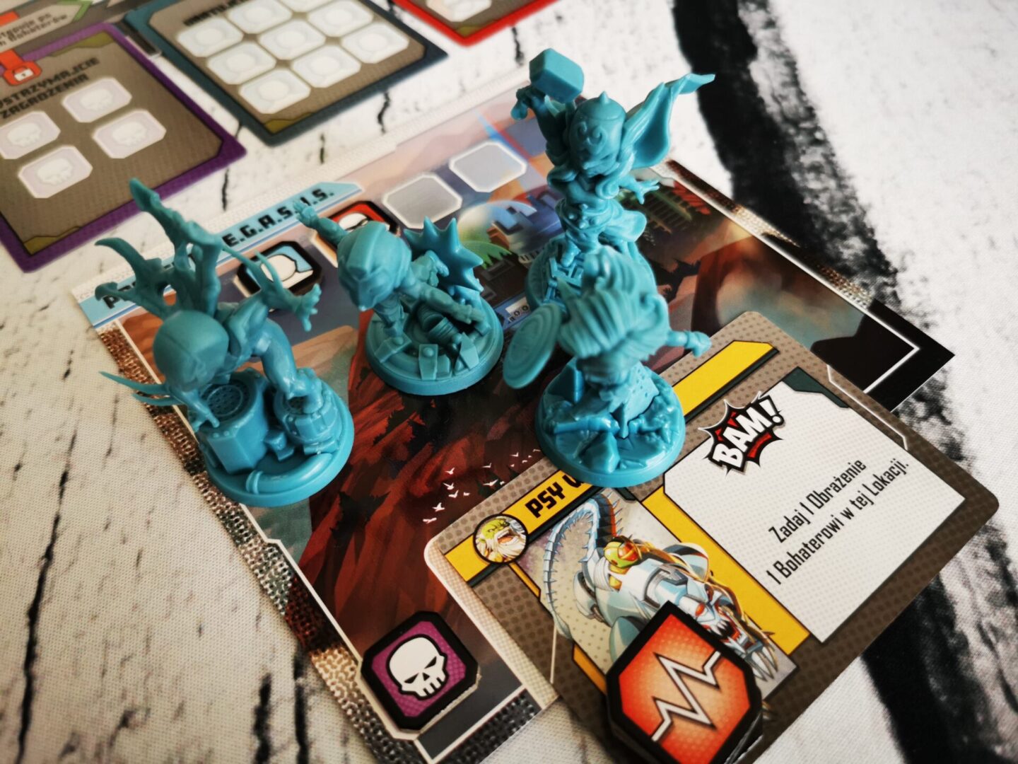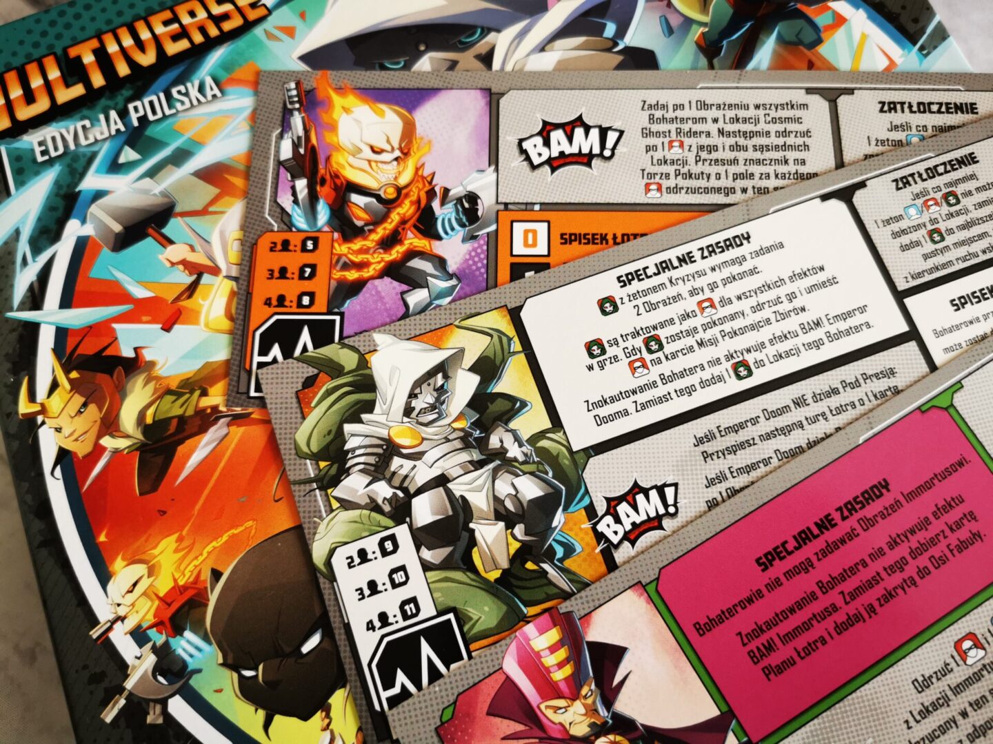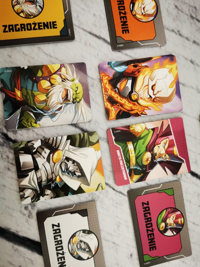 Mocną stroną nowego pudła Marvel United: Multiverse są łotrowie. W pudełku mamy czterech, z czego szczególnie dobrze bawiłem się przy Doktorze Doomie i Maestro. Ogólnie mam wrażenie, że z pudełka na pudełko poziom trudności jest śrubowany – i bardzo dobrze, w końcu bohaterowie też są mocni i mają się bohatersko zachowywać. Łotrowie jak to łotrowie, będą nam przeszkadzać w różnoraki sposób. Taki Maestro rozdaje obrażenia na prawo i lewo z prędkością karabinu maszynowego.
