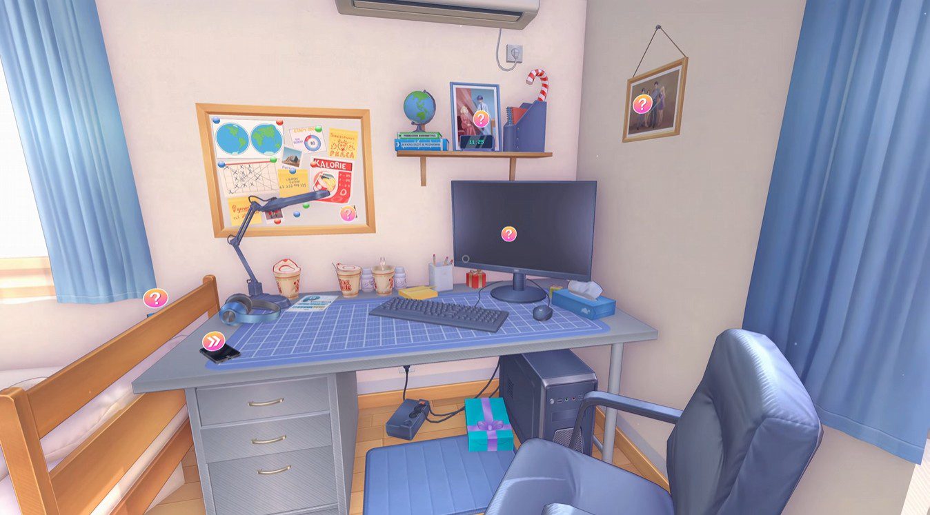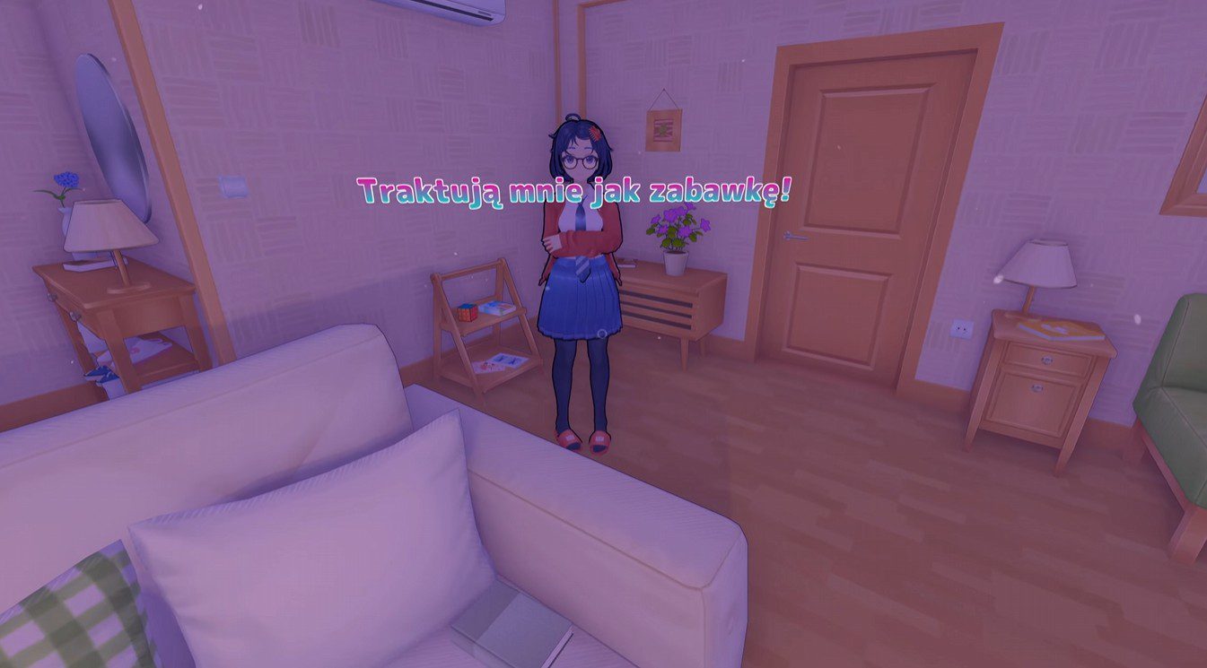 Na początku możesz swobodnie rozglądać się po mieszkaniu. Każdy obiekt oznaczony ikoną znaku zapytania pozwala na rozmowę z Mitą i pogłębia relację. W pierwszej kolejności podejdź do szafy w sypialni i zabierz wiszący z boku szkolny mundurek. Odblokuje on nowy strój Mity w kolekcji ubrań. Następnie udaj się do salonu i wejdź w interakcję z pilotem do telewizora leżącym na stole. Po obejrzeniu reklamy Dead Juice Mita zaproponuje Ci spróbowanie napoju – zgoda pozwoli zdobyć osiągnięcie Dead Juice.