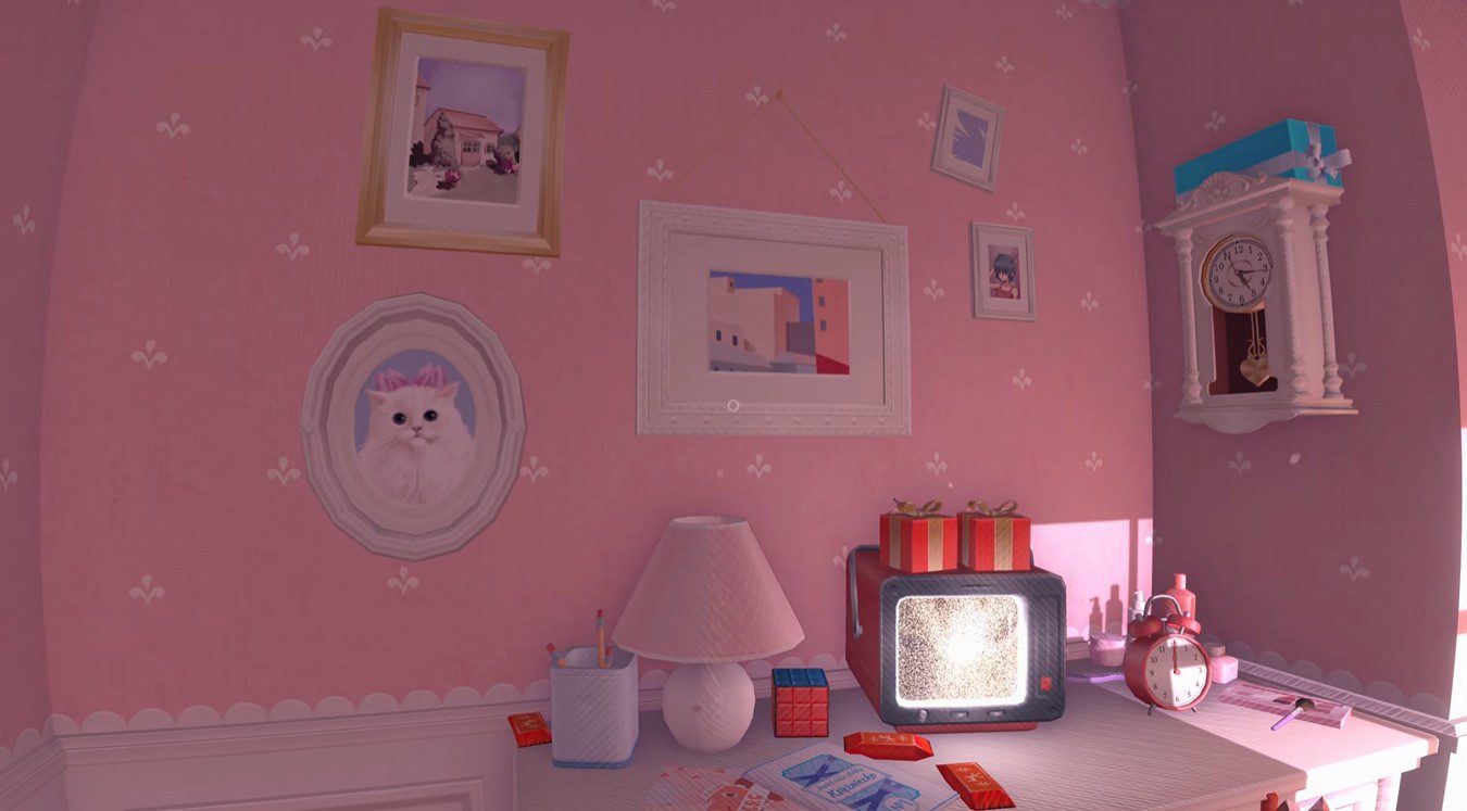 Następnie podejdź prosto do zdjęcia wiszącego na ścianie. Po odwróceniu się pojawi się możliwość przejścia dalej. W sypialni pomożesz Ghost Micie odzyskać wspomnienia, odnawiając fotografię. Najpierw sprawdź szuflady po prawej stronie drzwi wejściowych – znajdziesz tam kartridż postaci. Fragmenty zdjęcia ukryte są w kilku miejscach: na toaletce, w szafce nocnej z figurką, w komodzie z wazonem i różowymi pudełkami, poprzez wielokrotne klikanie różowej godziny na ścianie oraz zamykanie błędów systemowych przy drzwiach do łazienki.