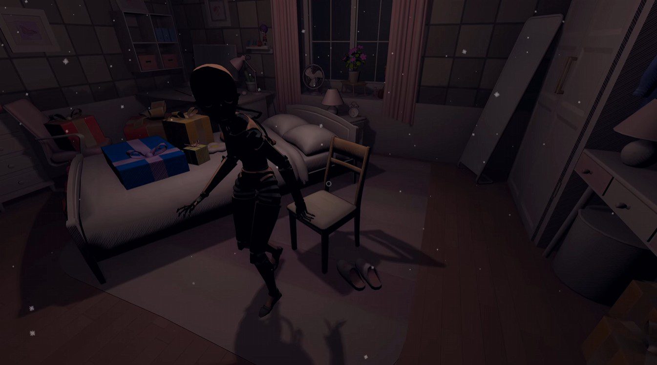 Po przejściu przez drzwi za dobrą Mitą trafisz do kolejnej wersji domu. Najpierw udaj się do sypialni i zabierz kartridż postaci ze stolika nocnego obok łóżka. Następnie wróć do kuchni i podnieś telefon leżący na stole, naciskając E. Od tego momentu zaczniesz sterować inną postacią widoczną na ekranie telefonu. Poruszaj się klawiszami WASD, przejdź do kuchni i stań twarzą w twarz… z samym sobą.