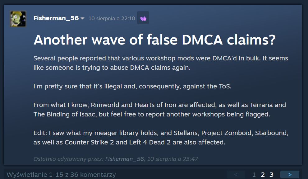 DMCA, czyli Digital Millennium Copyright Act, to narzędzie stworzone w celu ochrony praw autorskich. W teorii pozwala właścicielom treści usuwać nielegalne kopie swoich dzieł z internetu. W praktyce jednak system ten bywa wykorzystywany do nadużyć – i właśnie z takim przypadkiem mamy obecnie do czynienia. Zgłoszenia obejmują setki, a być może już tysiące modów, niezależnie od gatunku czy popularności gry. Punktem zapalnym miała być sytuacja wokół moda „The Fire Rises” do gry Hearts of Iron. Spór pomiędzy dwiema grupami twórców doprowadził do złożenia pierwszego zgłoszenia DMCA, które ostatecznie nie zakończyło się usunięciem pliku. Kilka tygodni później mod został jednak ponownie zaatakowany, a wkrótce lawina fałszywych roszczeń objęła całą platformę. W przeciwieństwie do serwisów takich jak YouTube, Steam nie wymaga od zgłaszającego przedstawienia twardych dowodów na posiadanie praw autorskich. Oznacza to, że teoretycznie każdy może złożyć DMCA przeciwko dowolnej zawartości, nawet jeśli nie ma z nią nic wspólnego.