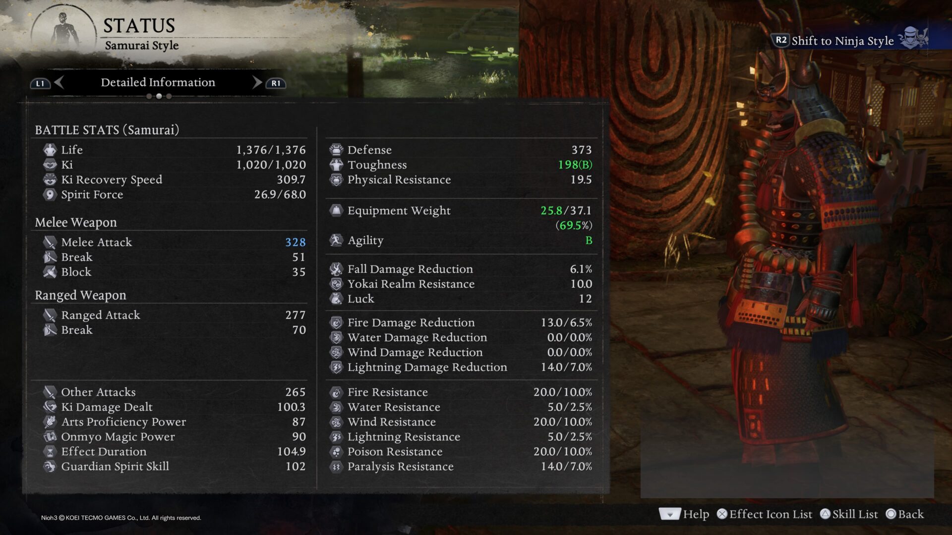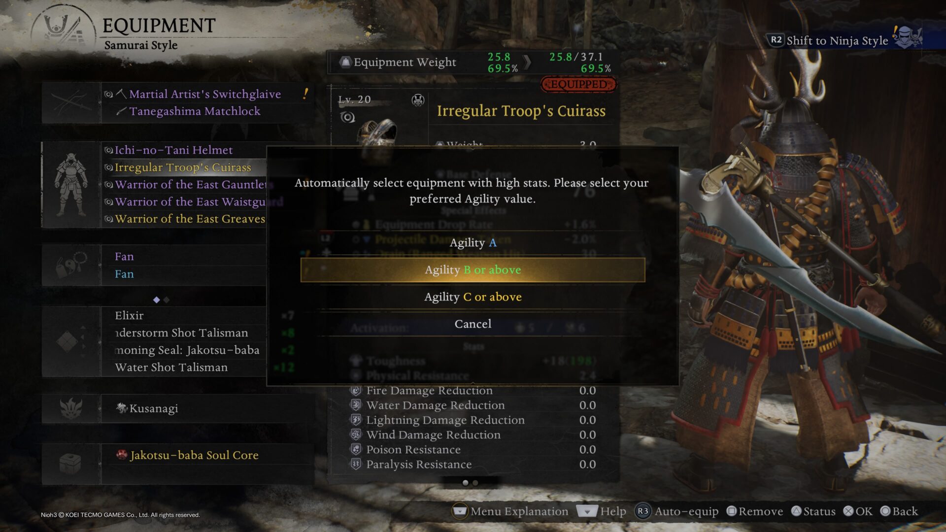 Ekwipunek w Nioh 3 jest podzielony na broń samuraja, broń ninja, broń dystansową, elementy pancerza, akcesoria dla obu stylów, przedmioty użytkowe, guardian spirit i soul cores. Na początku – szczególnie w pierwszym regionie (Warring States) – możesz spokojnie korzystać z Auto Equip. System dobiera najwyższy Attack dla twojego typu broni oraz najlepszą obronę przy zachowaniu określonej Agility, która wpływa na zużycie Ki przy atakach i unikach. Z perspektywy startu najważniejsze: nie schodź poniżej Agility C, bo poczujesz, że postać jest „zalana betonem”.