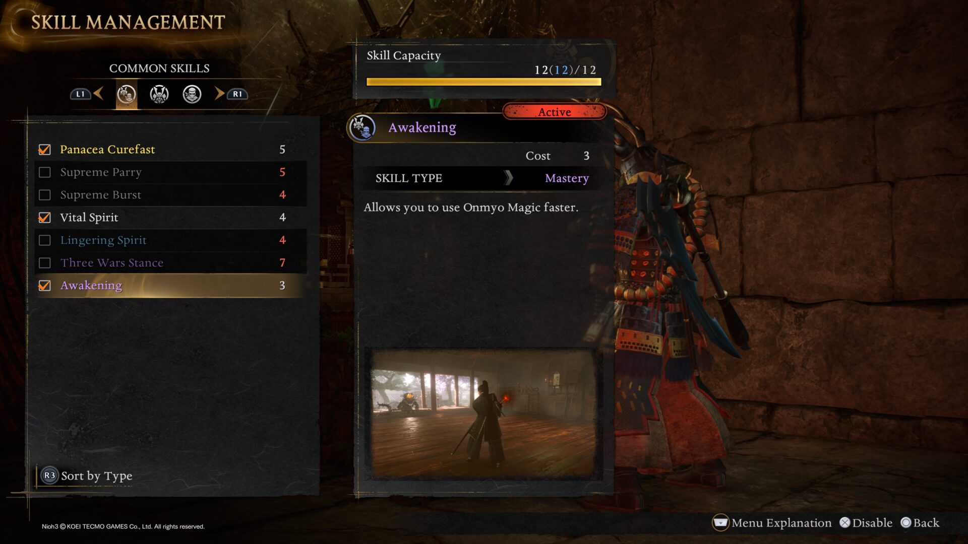 W Nioh 3 dostajesz nowy system Skills – to osobna warstwa pasywów niezależna od Martial Arts. Odblokowujesz je z Secret Skills Texts znajdowanych w świecie (ciała, skrzynie), a zakładasz w shrine. Są trzy kategorie: Common, Samurai i Ninja, a najmocniejsze z nich to Mastery skills, z których możesz mieć tylko jedną aktywną naraz. Każda kategoria ma limit pojemności i każdy skill ma koszt, więc nie da się założyć wszystkiego – musisz wybierać. Limit zwiększasz, znajdując Memorandums/Texty w świecie, więc eksploracja ma realny wpływ na moc builda.