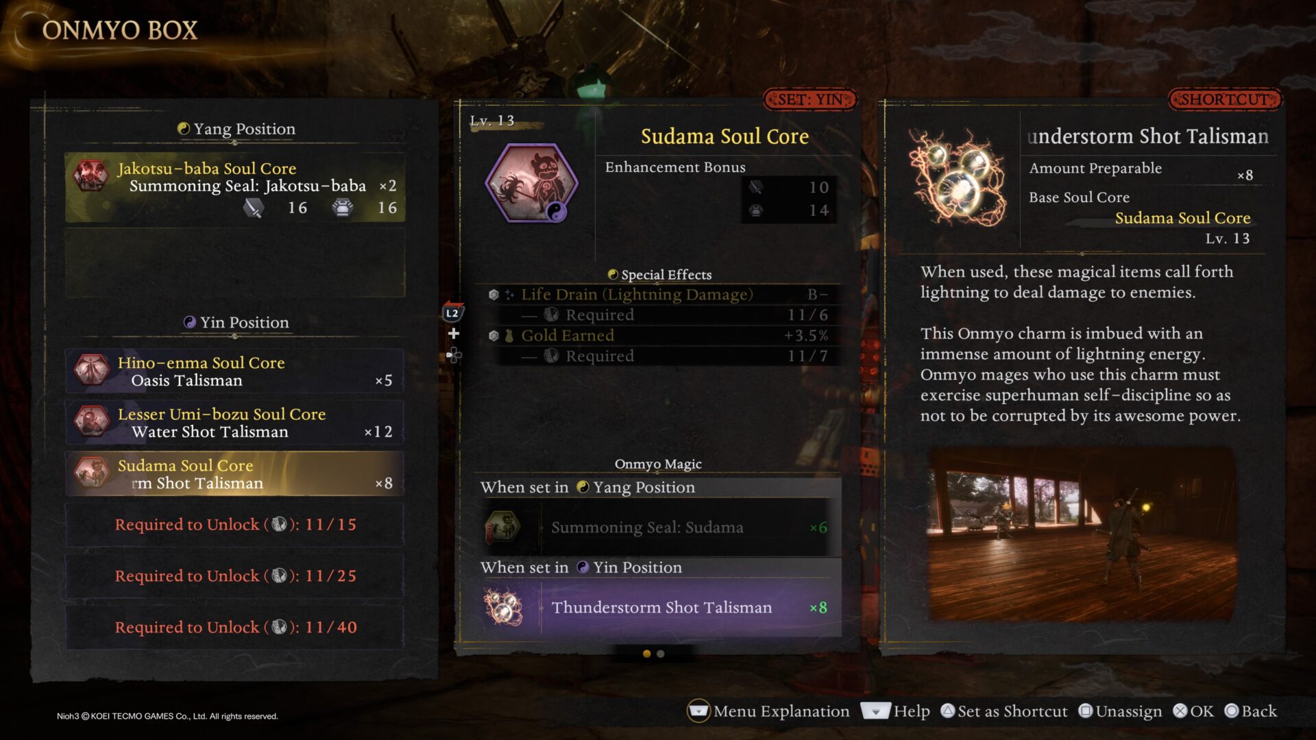 Onmyo Magic i Soul Cores to jeden z największych „boostów” dla początkujących w Nioh 3, bo te narzędzia są mocne i w praktyce odnawiają się za darmo przy Shrine. Soul Core wypada z wrogów w formie nieoczyszczonej – musisz ją purify przy kapliczce, inaczej po śmierci ją tracisz. W menu Onmyo Box masz dwa sloty: Yang i Yin. Yang odblokowuje summon (przywołujesz yokai do ataku), a Yin daje ci przedmiot Onmyo (buff, debuff albo ofensywne zaklęcie). Oba typy uzupełniają się przy odpoczynku, więc naprawdę warto ich używać często, zamiast trzymać „na czarną godzinę”.