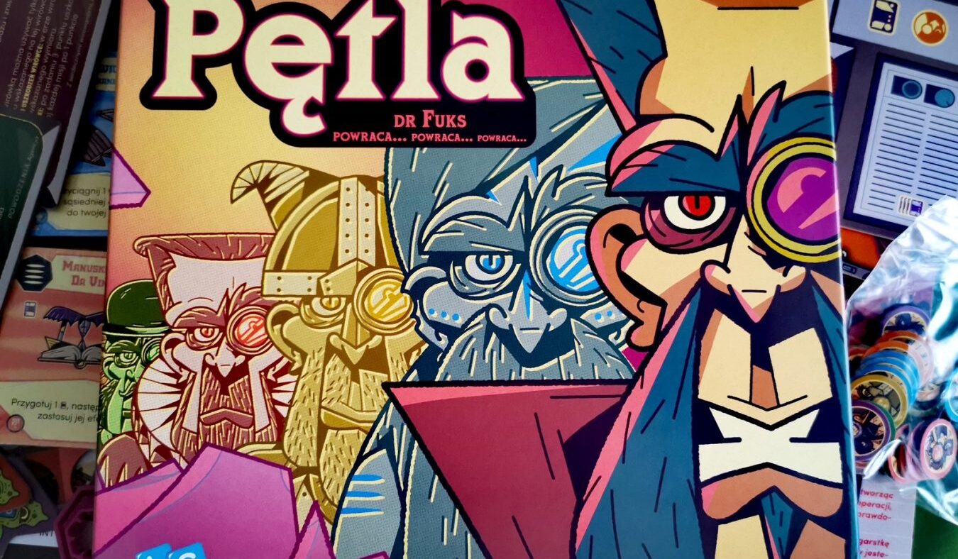 Pętla pierwotnie została wydana przez wydawnictwo Pandasaurus Games, które możecie kojarzyć z gier o dinozaurach – Wyspa Dinozaurów, czy Dinosaur World, który zmierza na polskie stoły. W gąszczu ich gier Lucrum Games wypatrzyło różowe i dość pokręcone pudełko z grą Pętla. Tematyka niebanalna, kooperacja i przyjemny wygląd po rozłożeniu gry – co tu może pójść nie tak? Czasami wszystko, ale na szczęście w tym przypadku to był strzał w sam środek i Lucrum zgarnęło pełną pulę, ponieważ Pętla to naprawdę dobry tytuł. Gra należy do gatunku gier kooperacyjnych, w które maksymalnie czterech graczy w godzinkę będzie walczyło z czasem i złym doktorem Fuksa, który chce namieszać w kontinuum czasoprzestrzennym. Działamy razem i zwyciężamy razem, ale na pomoc będziemy mieli potężne karty artefaktów. Uzbrojeni w dużą rolkę taśmy klejącej, czy przeterminowany currywurst (autentyczne nazwy kart) stawimy czoła wyrwom i klonom doktora panoszącym się po różnych okresach. Brzmi ciekawie, prawda?