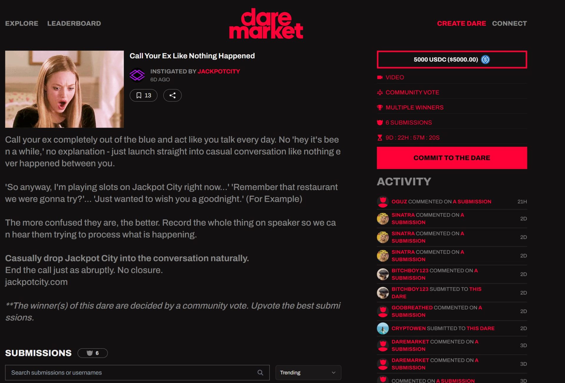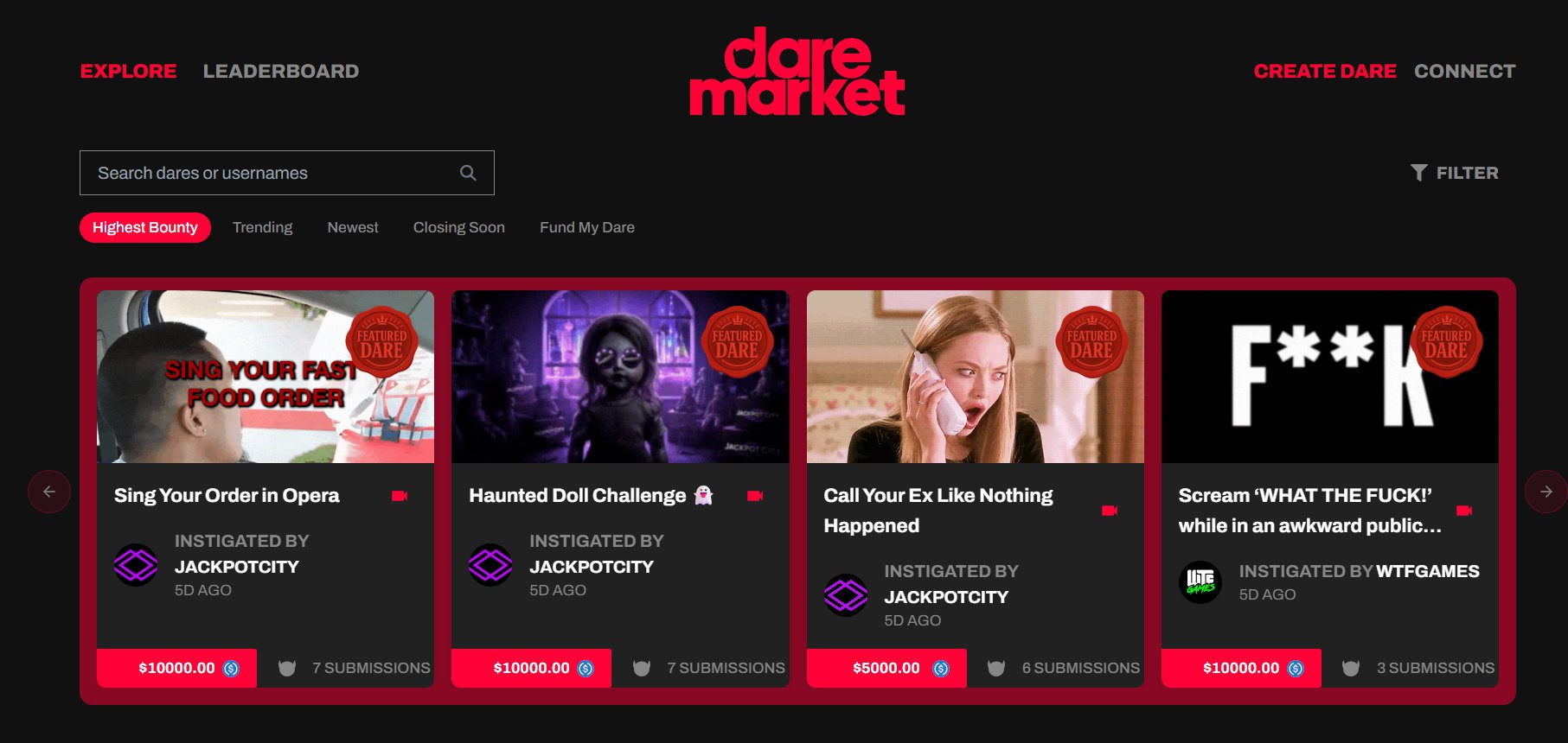 Pomysł jest prosty: użytkownicy mogą wymyślać wyzwania i ustalać, ile zapłacą osobie, która najlepiej je wykona. Inni internauci przesyłają nagrania swoich prób, a autor wyzwania wybiera zwycięzcę, który otrzymuje nagrodę w tokenach Solana (SOL). Jeśli ktoś nie zostanie wybrany – nie dostaje nic, mimo że wykonał zadanie. W efekcie Dare Market zdobywa ogromną ilość materiałów wideo i pobiera prowizję na poziomie około 7%. Według założycielki i CEO projektu, Isli Rose Perfito, Dare Market „oferuje dwie rzeczy, których najbardziej pragnie to pokolenie: pieniądze i sławę”. W praktyce oznacza to, że każdy może spróbować swoich sił w roli internetowego showmana, ale ryzykuje utratę prywatności, reputacji, a czasem nawet bezpieczeństwa.
