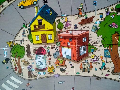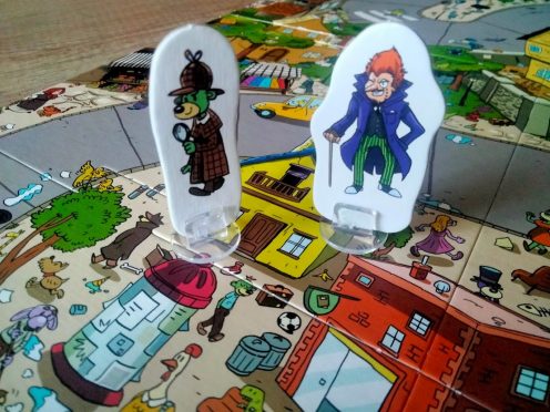 Sama plansza składa się z sześciu podwójnych elementów do złożenia, niczym puzzle. Jest na prawdę obszerna, bo zajmuje około metra. Z jednej strony fajnie, bo mamy czego szukać, z drugiej strony bardzo mi przeszkadzał jej pionowy układ. Zdecydowanie przyjemniej grałoby nam się, jeśli plansza ułożona byłaby w orientacji horyzontalnej, zwłaszcza w grze solo lub dla dwóch osób. To największy minus, jaki znajduję w tym tytule. O ile dzieciakom może to nie zrobić różnicy, rodzicom grającym ze swoimi dziećmi, owszem. Szkoda również, że plansza jest jednostronna, bo to ogromna strata pola do gry.
