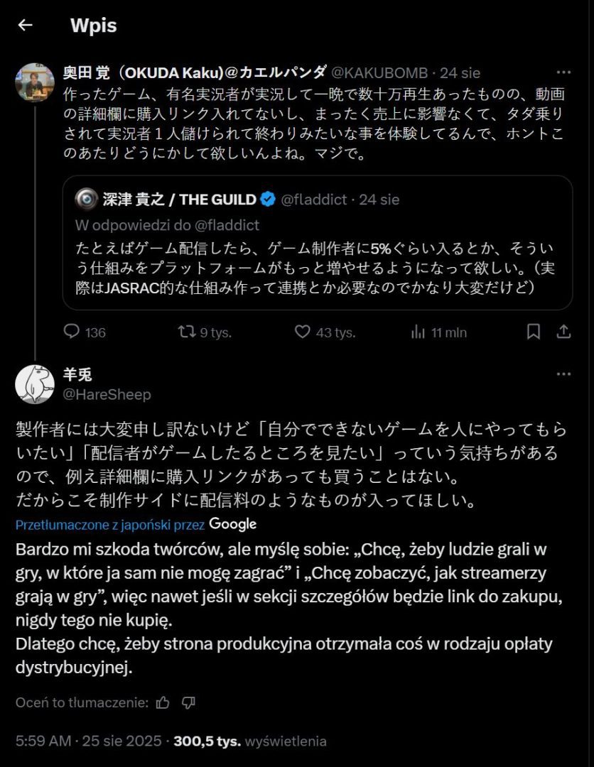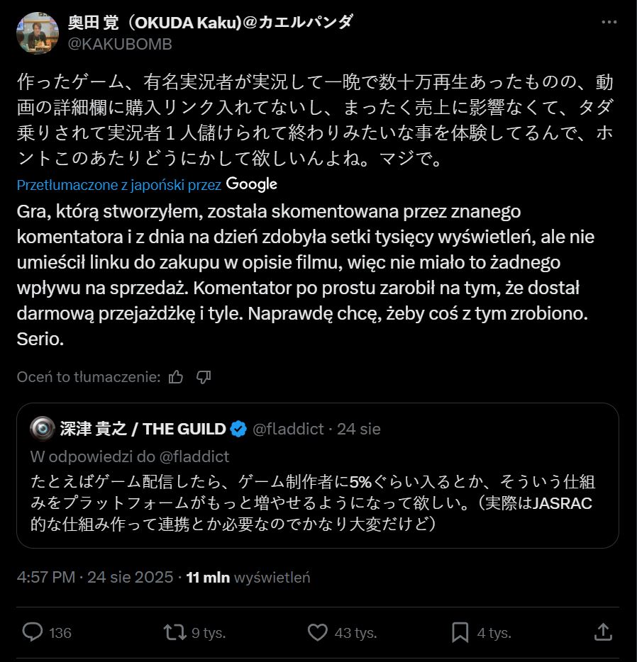 Japońska scena indie od dawna zmaga się z przesytem rynku. Każdego roku pojawiają się setki nowych tytułów, a gry – zwłaszcza te niezależne – mają coraz większy problem z przebiciem się do świadomości graczy. Streamerzy i youtuberzy są dziś potężnym kanałem promocji, jednak nie zawsze przekłada się to na realne zyski dla twórców. Deweloper Okuda Kaku podzielił się swoją historią, która wywołała szeroką dyskusję w mediach społecznościowych. Okuda opowiedział o sytuacji, w której znany streamer z ponad dwoma milionami subskrybentów zagrał w jego produkcję. Transmisja zdobyła setki tysięcy wyświetleń w jedną noc, lecz autor gry nie zauważył żadnego wpływu na sprzedaż swojego tytułu. Streamer nie umieścił nawet linku do strony gry. „Streamer zarobił szybkie pieniądze, a ja nie zyskałem nic – to powtarza się coraz częściej. Chciałbym, żeby coś się w tej kwestii zmieniło” – napisał Okuda.
