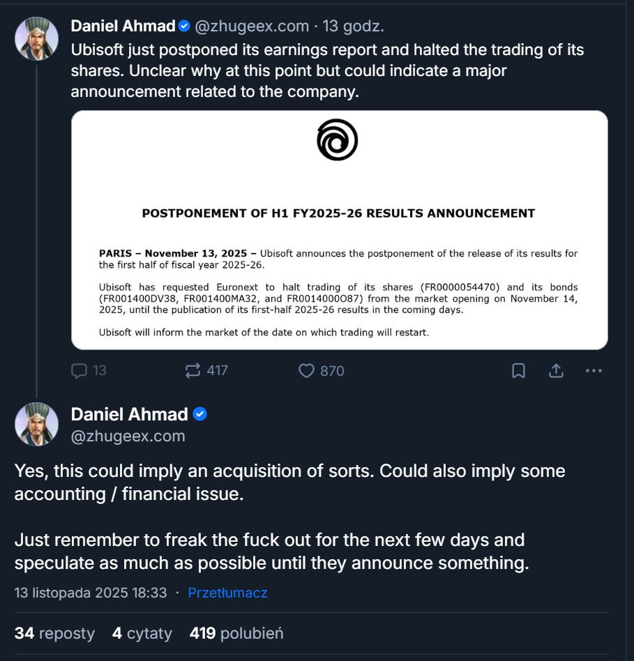 Branżowy analityk Daniel Ahmad, obserwujący rynek gier w Azji i regionie MENA, zauważył w swoich komentarzach, że taka decyzja może wskazywać na bardzo ważne ogłoszenie, być może dotyczące przejęcia. Zwrócił jednak uwagę, że równie prawdopodobne są kwestie finansowe, takie jak wykrycie błędów w sprawozdaniu lub konieczność jego rewizji. Jego pół-żartobliwa sugestia, by „wszyscy spanikowali i spekulowali do woli”, dobrze oddaje atmosferę, jaka powstała po oświadczeniu Ubisoftu – branża przeszła w tryb oczekiwania, a każdy kolejny dzień braku informacji tylko podsyca niepewność.