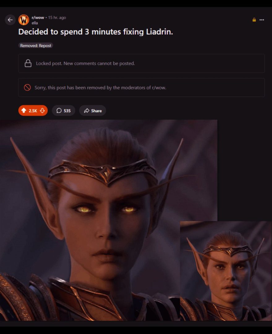 Społeczność od lat czeka na to, aby Blizzard przypomniał sobie o dawnej świetności swoich kinowych cinematiców i dobrą okazją na to był właśnie gamescom 2025. To one tworzyły legendę serii, sprawiały, że gracze mieli ciarki, oglądając Variana walczącego w Legion czy Anduina w The War Within. Tymczasem Midnight miało być powiewem świeżości, a dostarczyło czegoś zupełnie odwrotnego – filmu, który wielu graczy uznało za najgorszy cinematic w historii World of Warcraft. Najwięcej krytyki spadło na wygląd Krwawych Elfów, czyli Liadrin i Lor’themara. To właśnie oni mieli być gwiazdami nowego zwiastuna, ale ich modele wyglądają tak, jakby ktoś „zapomniał”, jak wygląda charakterystyczna rasa z uniwersum Warcrafta. Brak świecących oczu – cechy absolutnie definiującej Krwawe Elfy – sprawił, że społeczność natychmiast zauważyła, iż postacie przypominają raczej elfów z The Elder Scrolls Online niż bohaterów Azeroth. Liadrin, zamiast być ikoną elfiej urody, została określona mianem „człowieka z doklejonymi uszami”. Komentarze graczy mówią same za siebie – „Botoksowa twarz CGI”, „Figurka z wosku” czy „Pierwszy cinematic, w którym nie byłem pewien, czy to na pewno WoW”.
