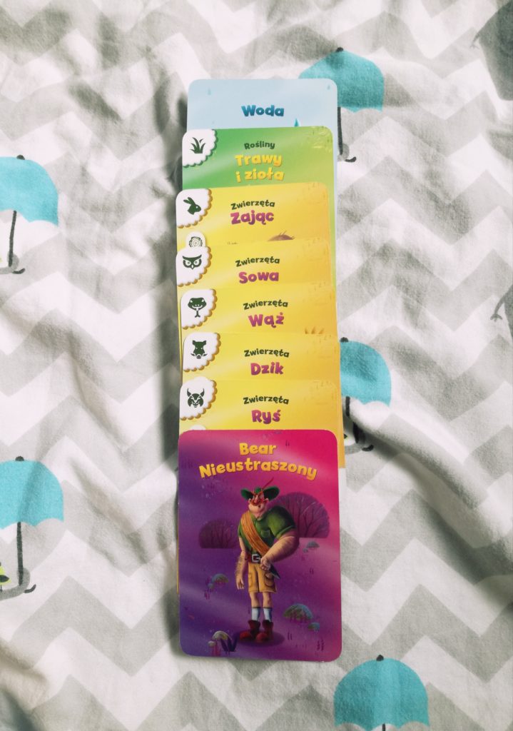 Na stracie każdy z graczy dostaje jedną kartę wody oraz 5 losowych kart. Reszta ląduje na zakrytym stosie. I tak rozpoczyna się wycieczka po łańcuchach pokarmowych, a podróż tą rozpoczyna osoba, która zjadła ostatnio coś nietypowego (przy moim dziecku, które zna 7 wariantów omleta, i na moje nieszczęście 6 z nich sama jej pokazałam, nie jest trudnym wytypowanie takiego gracza). Zadaniem uczestnika jest pozbycie się wszystkich kart z ręki układając właśnie łańcuchy zależności pokarmowych. Patent jest prosty: dzięki wodzie rosną rośliny, rośliny są zjadane przez zwierzęta, zwierzęta są pożywieniem dla innych zwierząt (w tym ludzi), a wszystko zjeść może tylko Bear Nieustraszony (bo jest surwiwalowcem z krwi i kości i nie wybrzydza, tylko je). Całość urozmaicają karty akcji, które według swoich właściwości mogą nieco namieszać robiąc przykładowo „cofkę” za pomocą karty „Wrażliwy żołądek”, lub odwracając łańcuch pokarmowy za pomocą karty „Świat na wspak”.