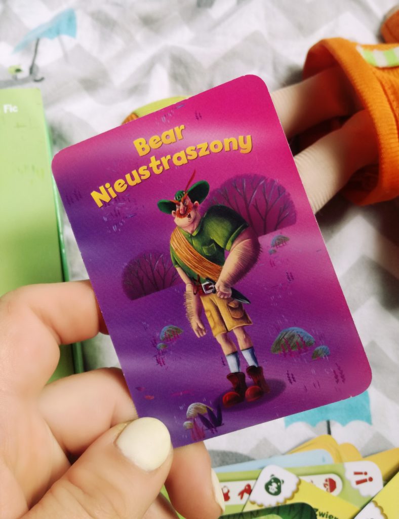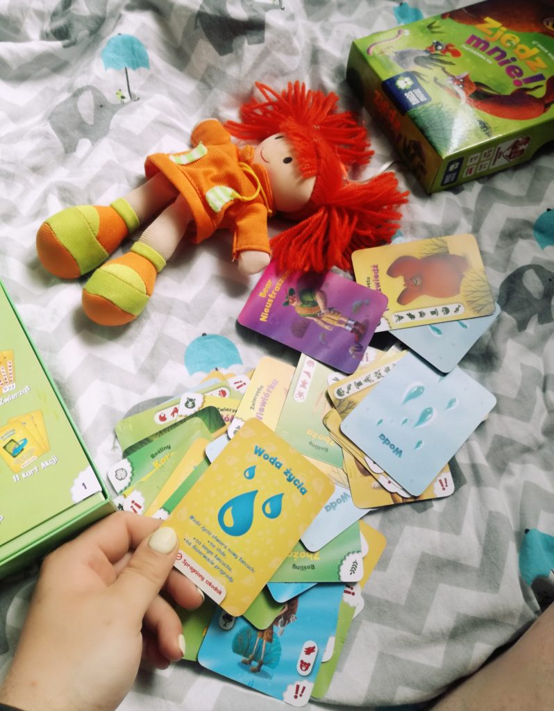 Pewnie już macie dosyć mojego zachwalania niewielkich gabarytowo gier, ale musicie mnie zrozumieć – mój nowy regał na gry ma 7 półek (poprzedni miał 4) a i tak jest zapchany i to ostatnio nie tylko grami. (Pluszak Zumy z „Psiego Patrolu” musi pilnować kodowanek, a panda woli tradycyjnego „Chińczyka” – sami rozumiecie). Będę to powtarzała w każdym razie do znudzenia – niewielkie pod względem rozmiaru gry to błogosławieństwo każdego rodzica. „Zjedz mnie” to 60 kart: 12 kart wody, 12 roślin, 21 zwierząt, 3 ludzi, 11 akcji i jedna jedyna karta Beara Nieustraszonego. Gra teoretycznie przeznaczona jest dla sześciolatków i dzieci starszych, ale jak już też pewnie się domyślacie – drobne przystosowanie i grać mogą dzieci młodsze. Rozgrywka trwa maksymalnie pół godziny (z przerwą na kanapkę), a do jej przeprowadzenia wystarczy już dwóch graczy. Karty – jak to karty – są wykonane z grubszego, nielaminowanego jakoś specjalnie papieru, ale są na tyle wytrzymałe, że dopóki specjalnie nikt nie postanowi ich oznaczyć lub nie zniszczy w inny nieprzewidywalny sposób – dają radę. Jeśli wiemy już jak to wygląda to przejdźmy do grania.